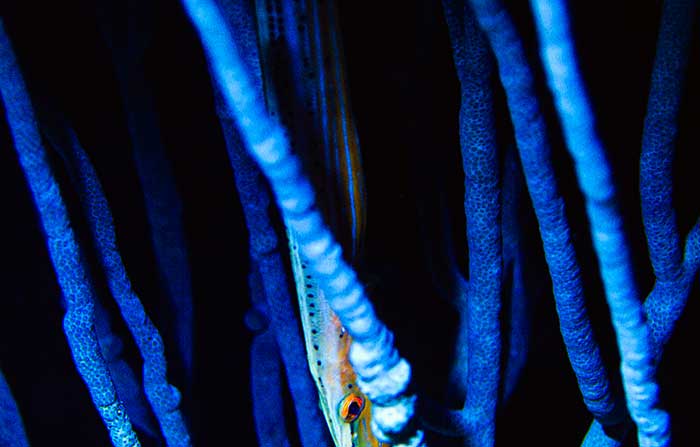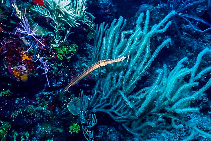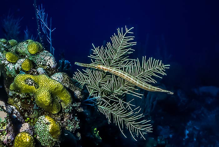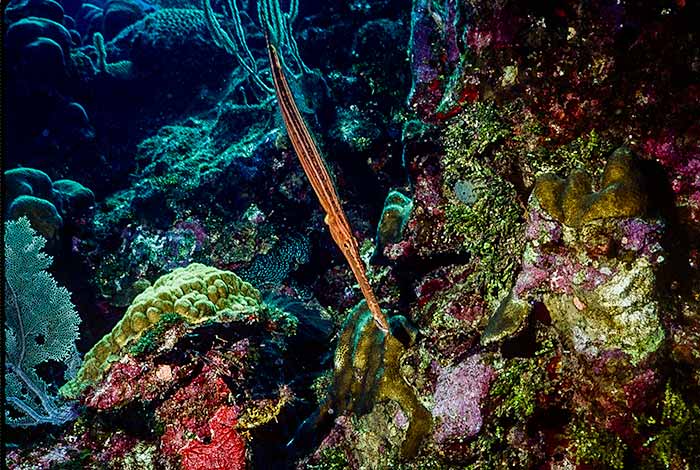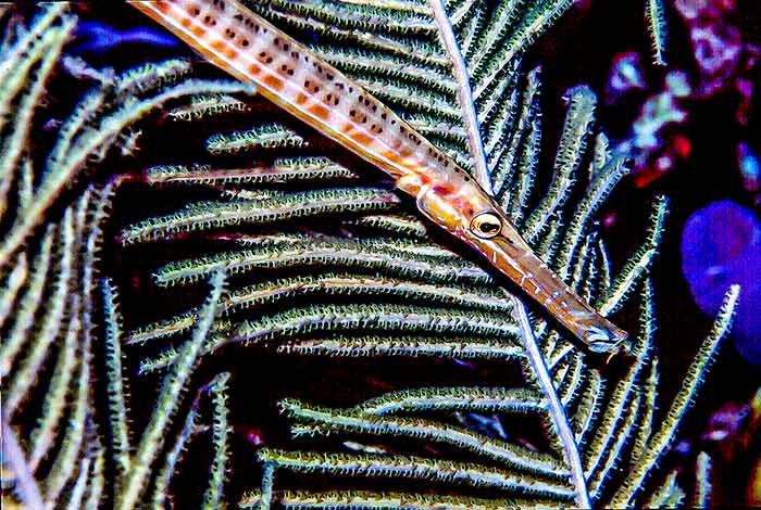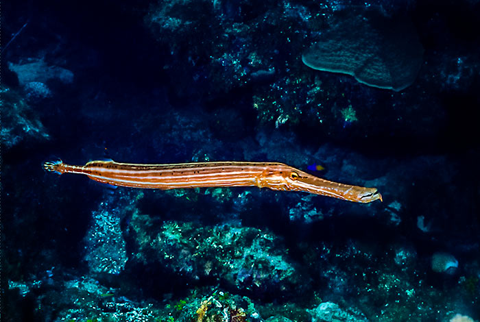 These fish are long (0.8m to 1.8m), extremely slender fish associated with tropical reefs. The snout is especially long with a supprisingly large mouth, which enables them to capture other fish. They are lie-in-wait predators that conceal themselves either by hanging in the water column above the reef, by hanging close to the reef itself (often vertically with soft coral or elongated sponges to hide), or by associating closely with large browsing fish (like parrotfsh).