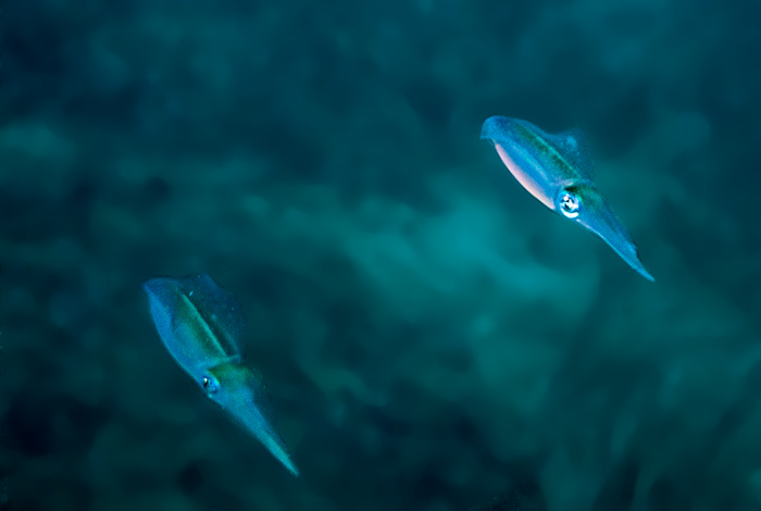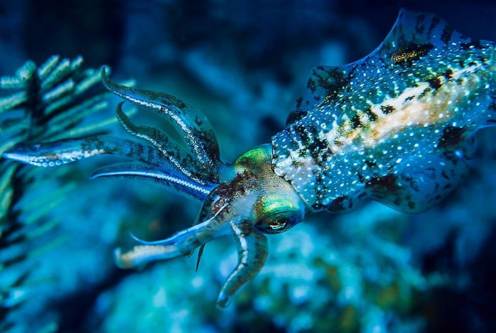 The CLASS Cephalopoda consists of Octopus, Squid, Cuttlefish, and Nautilus. Here you will find only Octopus and Squid. Anyone who has observed cephalopods underwater may have seen them squirt an inky smokescreen. The ink is porduced by a gland within the mantle. The ink is ejected during times of stress as a deterrent to escape potential predators. Most reef cephalopods have a very short life span that ranges from about 1-3 years. Besides fisherman, their main enemies are large caniverous fishes and sharks. Squid and cuttlefish are also consumed regularly by sea birds. In prime dive locations where fishing is prohibited their life span is much better.