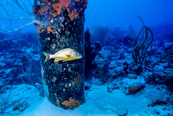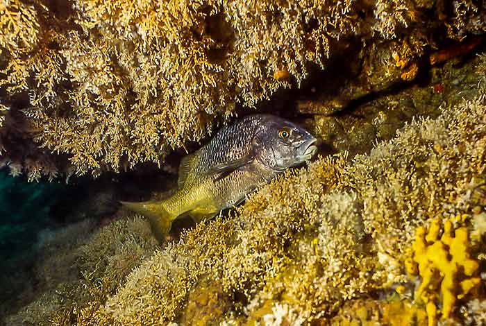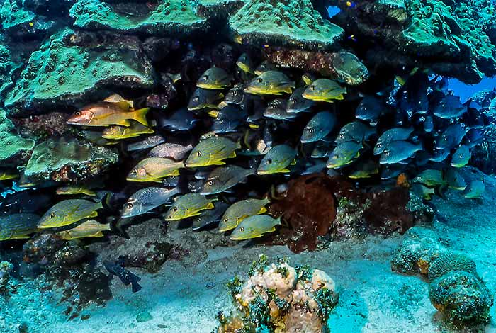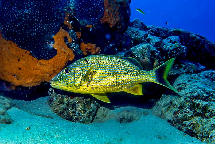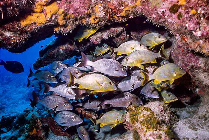 Grunts congregate during the day in small groups to large schools that drift in the shadows of reefs. At night , the nocturnal feeders scavenge the sand flats and grass beds near reefs for crustaceans. The name is derived from the sound produced by the grinding of their teeth.