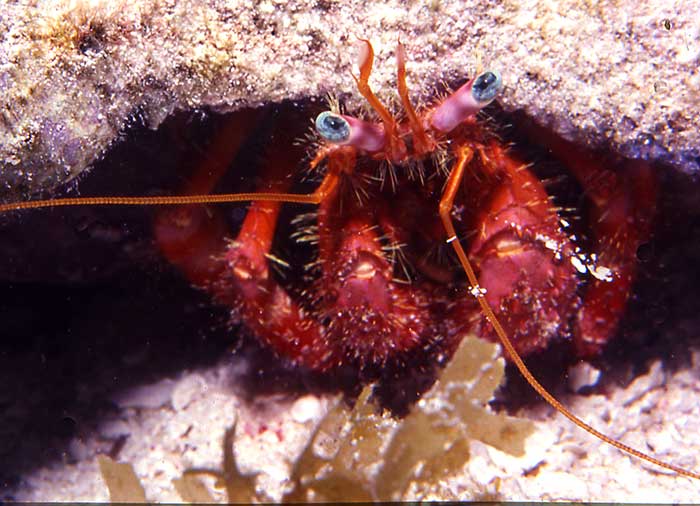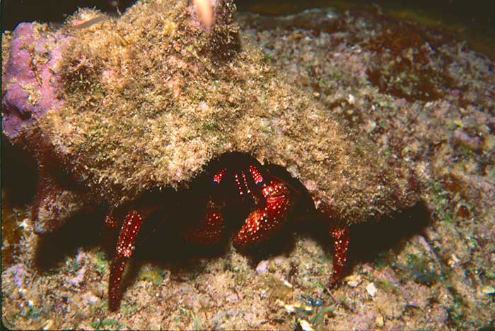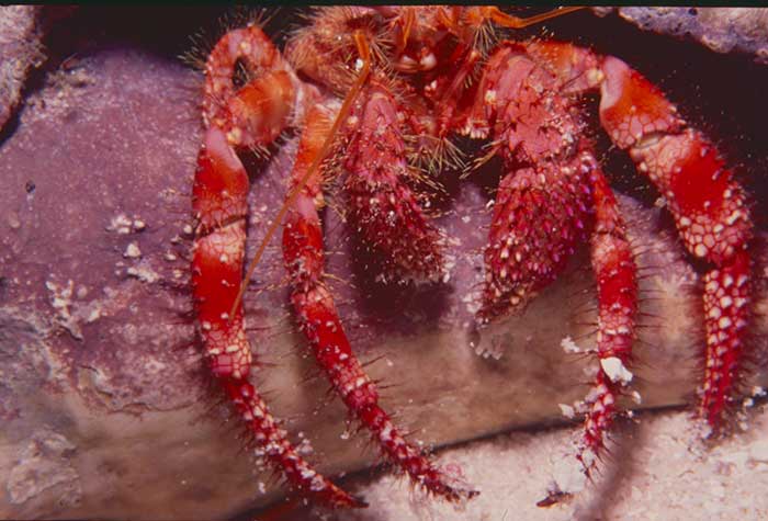Most species of hermit crabs have long, spirally curved abdomens, which are soft, unlike the hard, calcified abdomens seen in related crustaceans. The vulnerable abdomen is protected from predators by a salvaged empty seashell carried by the hermit crab, into which its whole body can retract. Most frequently, hermit crabs use the shells of sea snails (although the shells of bivalves and scaphopods are used by some species). The tip of the hermit crab's abdomen is adapted to clasp strongly onto the columella of the snail shell. The pictures here were taken in the Gulf of Mexico, Caribbean and the Indo-Pacific off of Borneo.