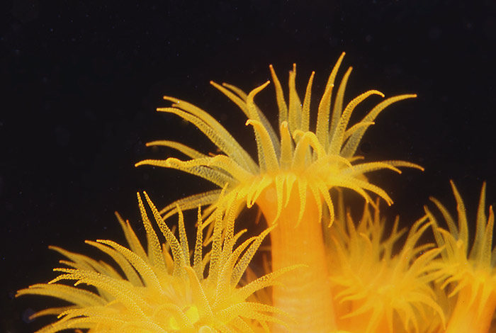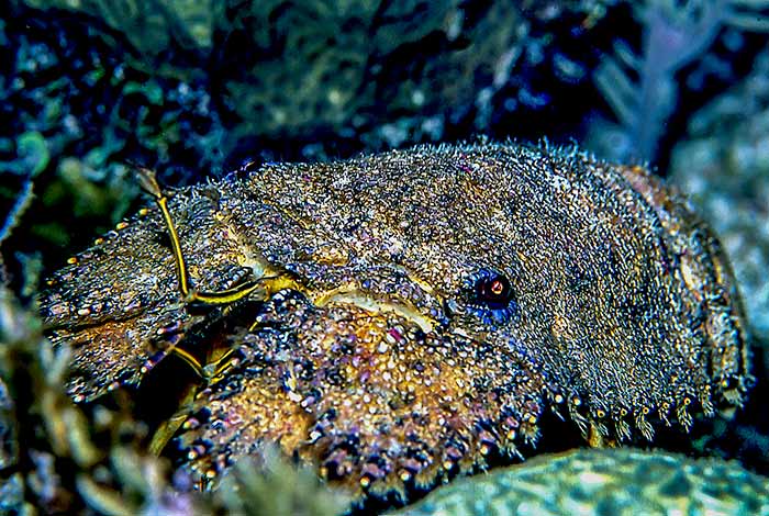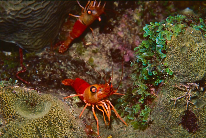 All the photographs on this page were taken at night. Most of these subjects hide by day and emarge at night. I inclueded parrotfish here because they bed down at night and change to night colors. The orange cup coral can be seen by day but extend their tenticles at night to feed. The toadfish are found only at night by zeroing in on the croaking sound they make. The red night shrimp are found by their glowing eyes. The basket star unfurls its arms only at night. Some octopus can be seen during the day, but the Caribbean Reef Octopus only comes out at night.