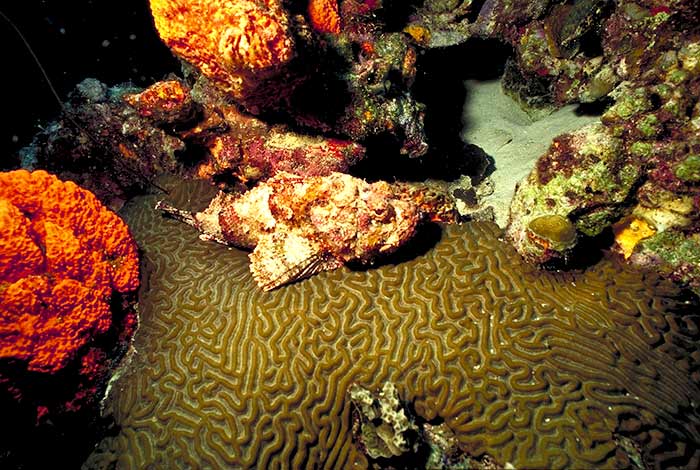 Scorpionfish have large heads, large mouths and eyes, and stout, laterally compressed bodies with large pectoral fins. They are bottom-oriented predators that sit quietly on reefs and are extremely well camouflaged. They are best known for their spines that possess some of the most deadly fish venom known. It is a neurotoxin that can be injected by a Scorpiafish by means of venom glands at the base of hypodermic-like hollow dorsal spines.