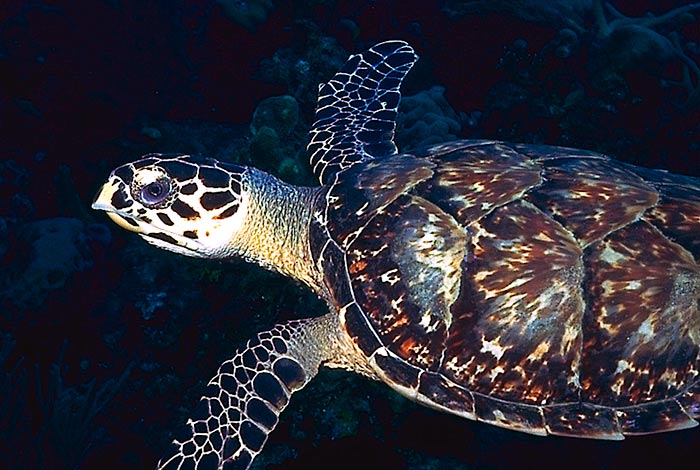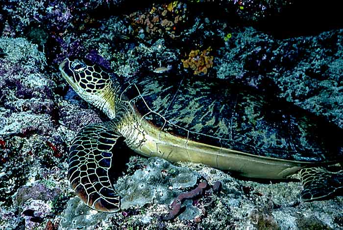 Sea turtles are generally found in the waters over continental shelves. After taking to the water for the first time, males will not return to shore ever again. During the first three to five years of life, sea turtles spend most time in the pelagic zone floating in seaweed beds. Green sea turtles in particular are often found in Sargassum beds, a brown seaweed in which they find shelter and food. Once the sea turtle has reached adulthood it moves closer to the shore. Females will come ashore to lay their eggs on sandy beaches during the nesting season. Of the seven species of marine turtles four are listed as endangered or critically endangered. Although sea turtles usually lay around one hundred eggs at a time, on average only one of the eggs from the nest will survive to adulthood. While many of the things that endanger these hatchlings are natural, such as sharks, raccoons, foxes, and seagulls, many new threats to the sea turtle species have recently arrived and increased with the ever-growing presence of humans.